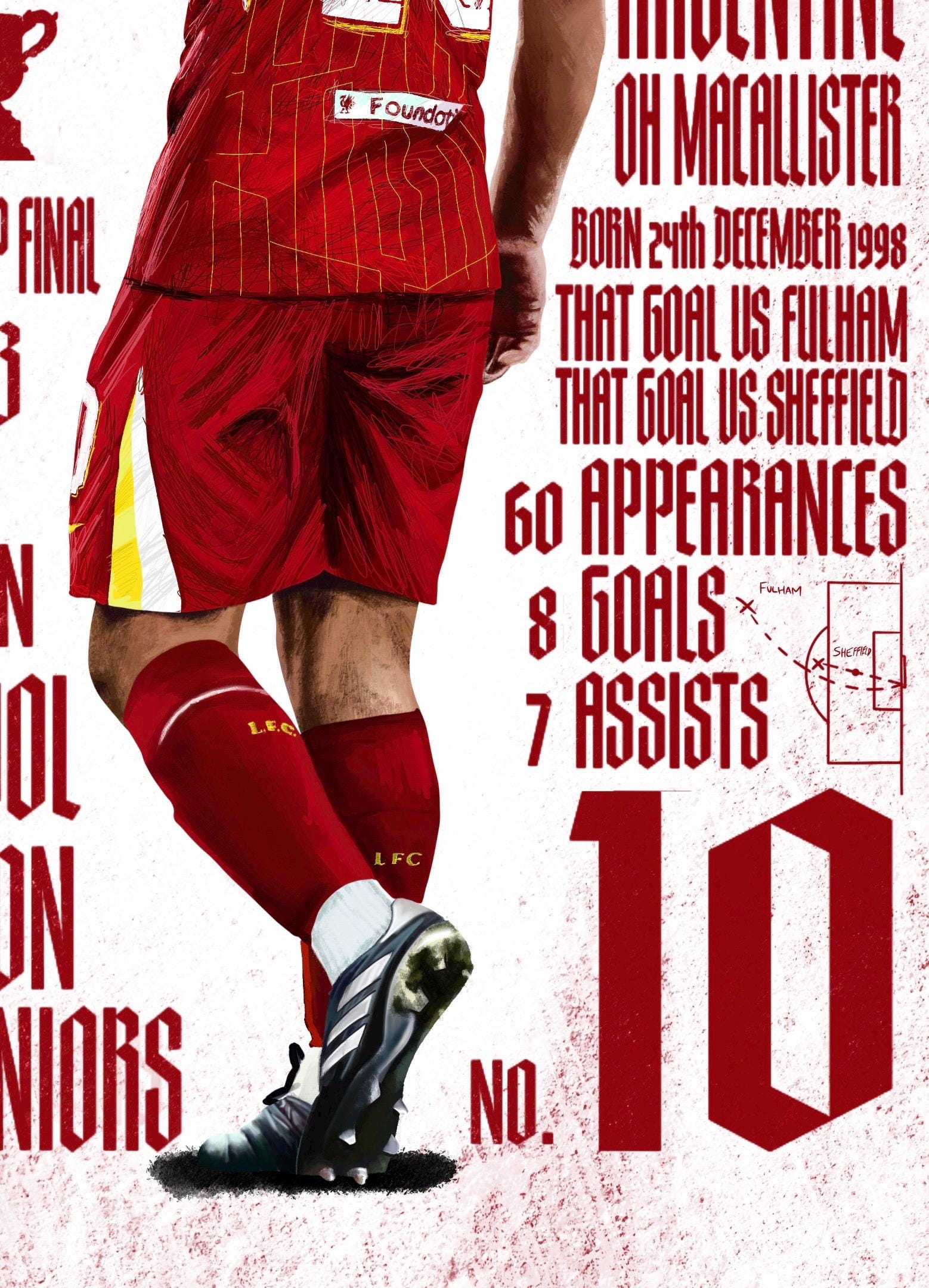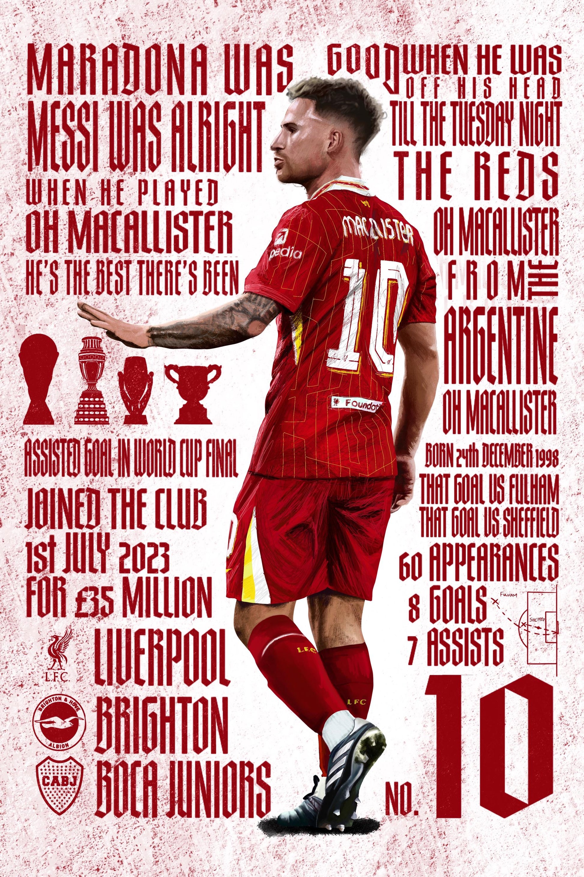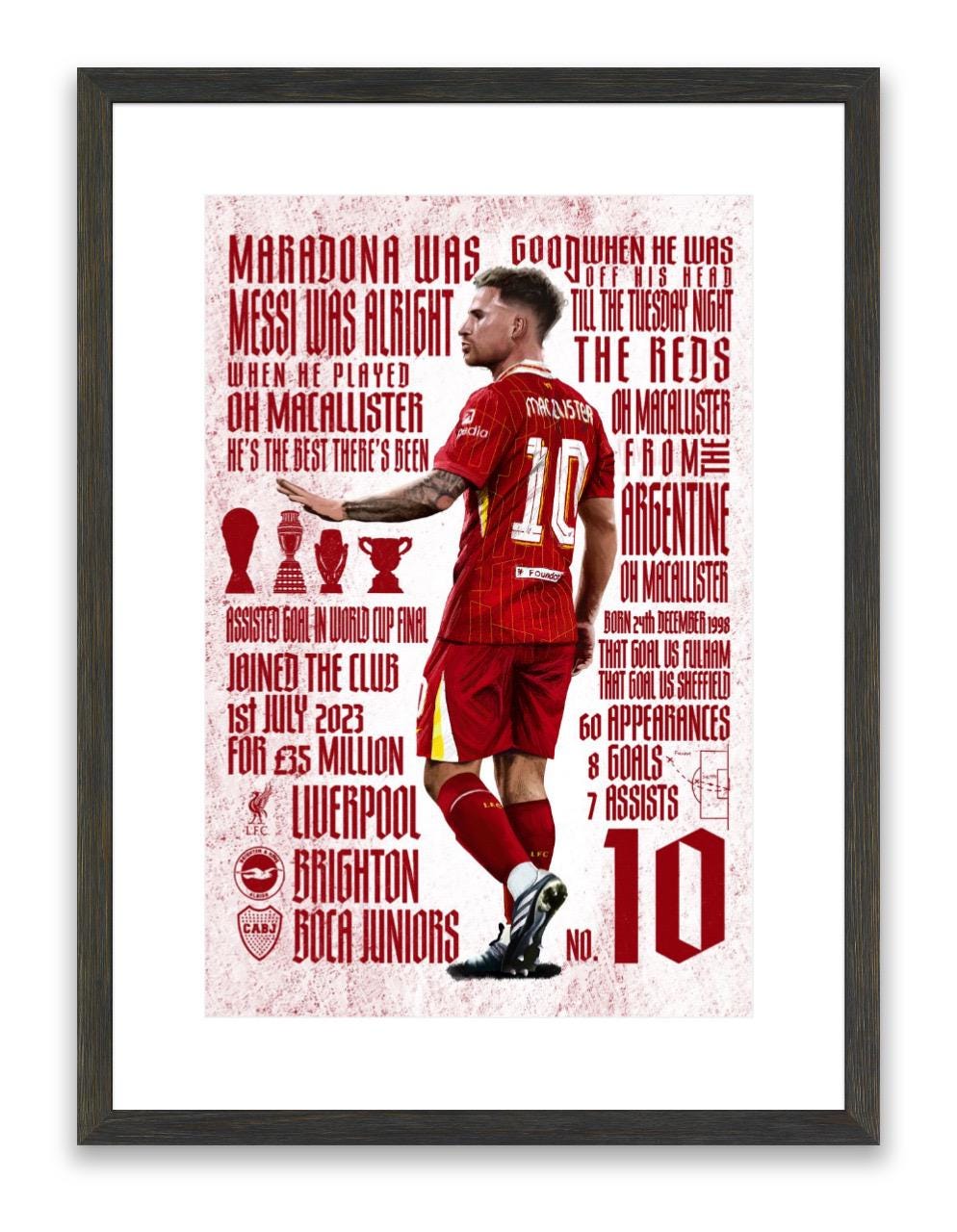 This print is of Liverpool and Argentina midfielder Alexis McAllister. Completed on procreate, this print includes his new chant along with his accolades and stats from when he joined the reds. Available in 3 different sizes in very high quality print!