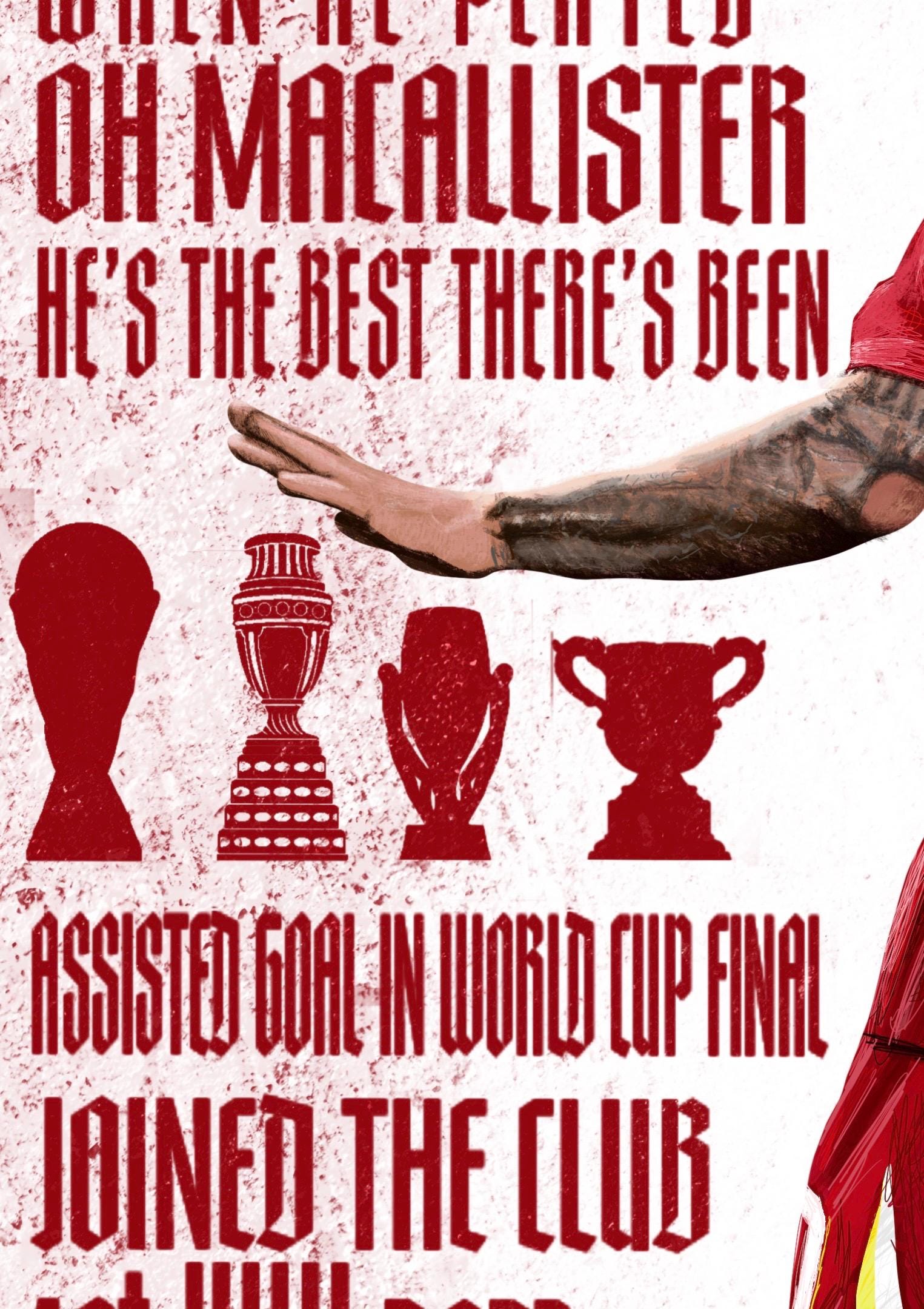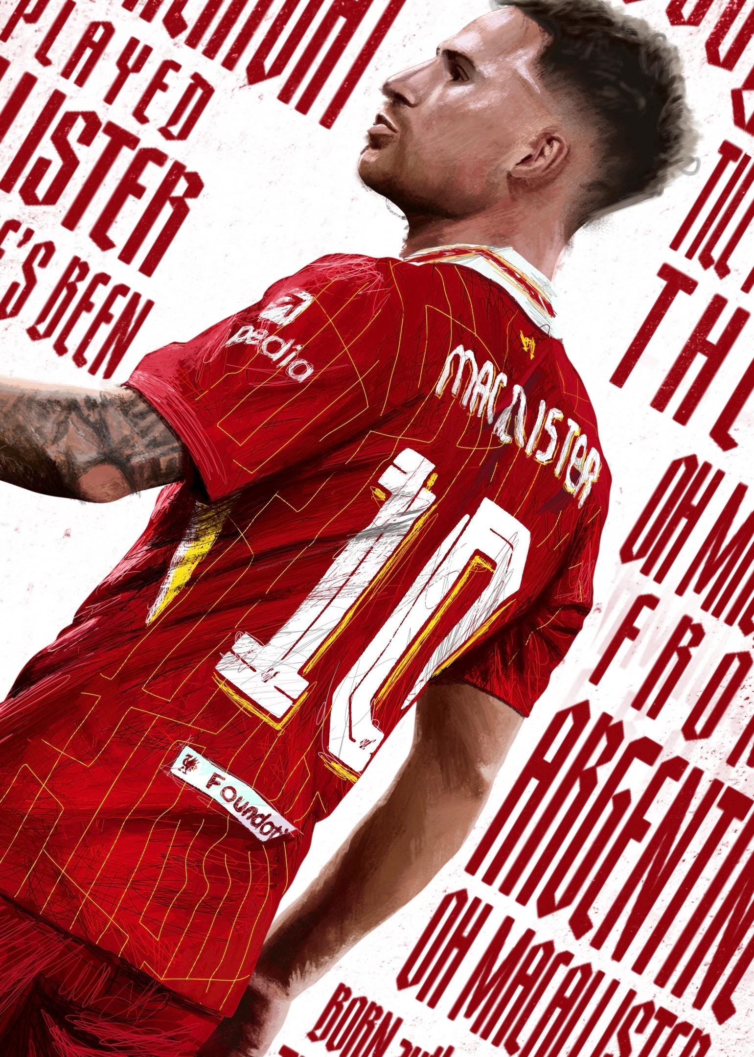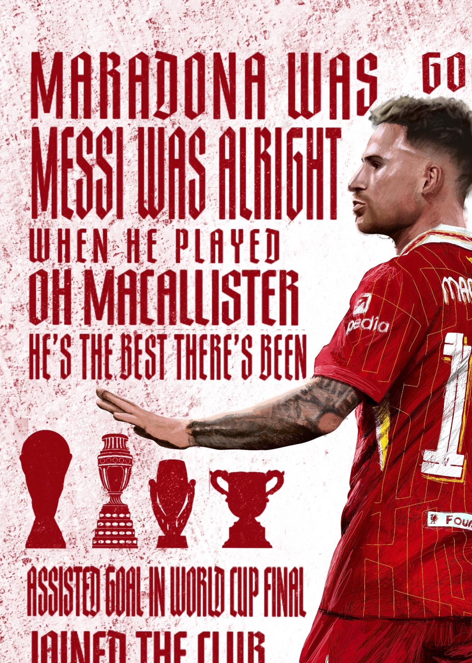 This print is of Liverpool and Argentina midfielder Alexis McAllister. Completed on procreate, this print includes his new chant along with his accolades and stats from when he joined the reds. Available in 3 different sizes in very high quality print!