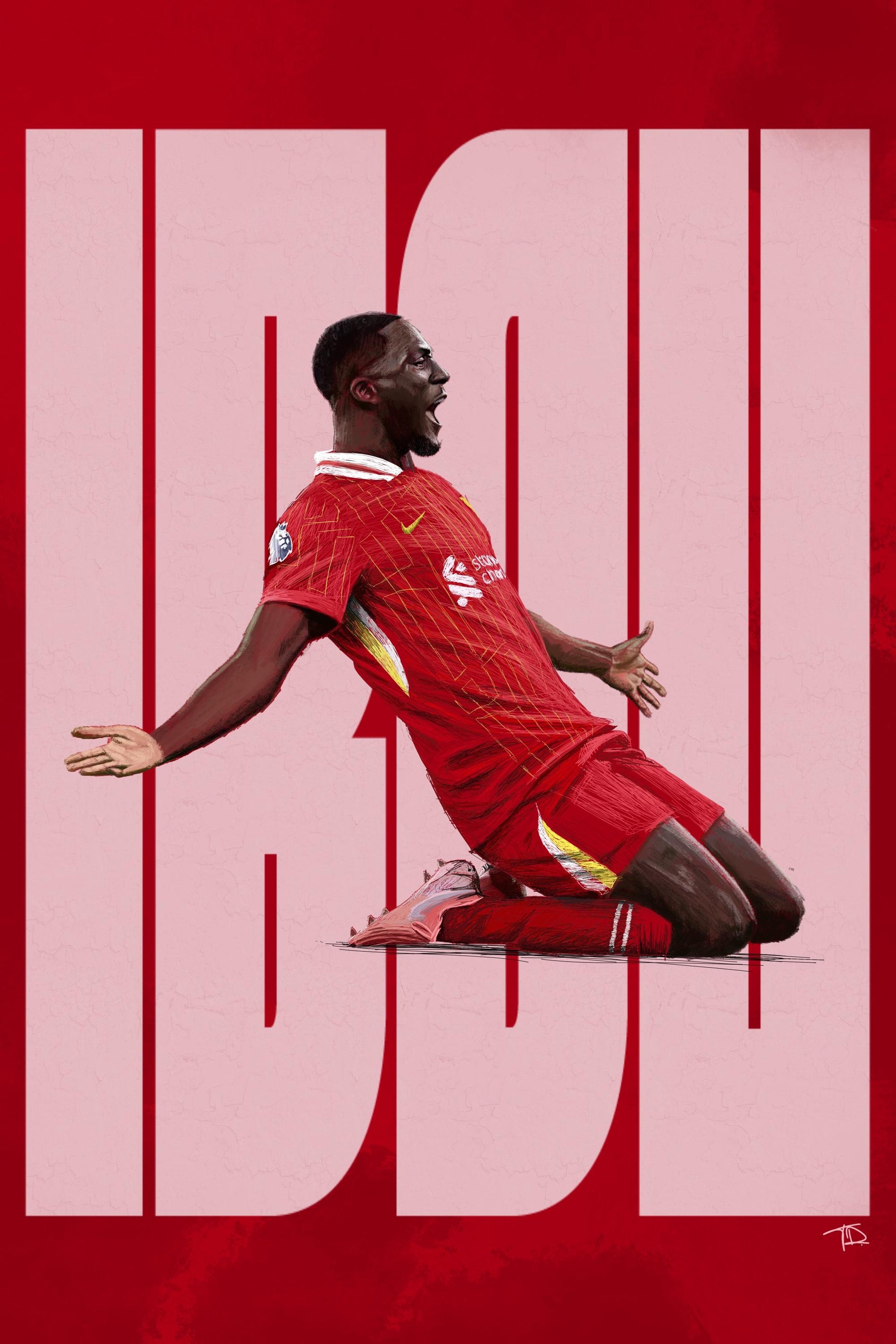 This digital art piece is of French national and Liverpool defender Ibrahima Konate. He has 58 appearances for Liverpool, and my drawing is of his celebration from his one and only goal against Wolves. Offered in 3 different sizes, this print is a perfect present for any Liverpool fan!