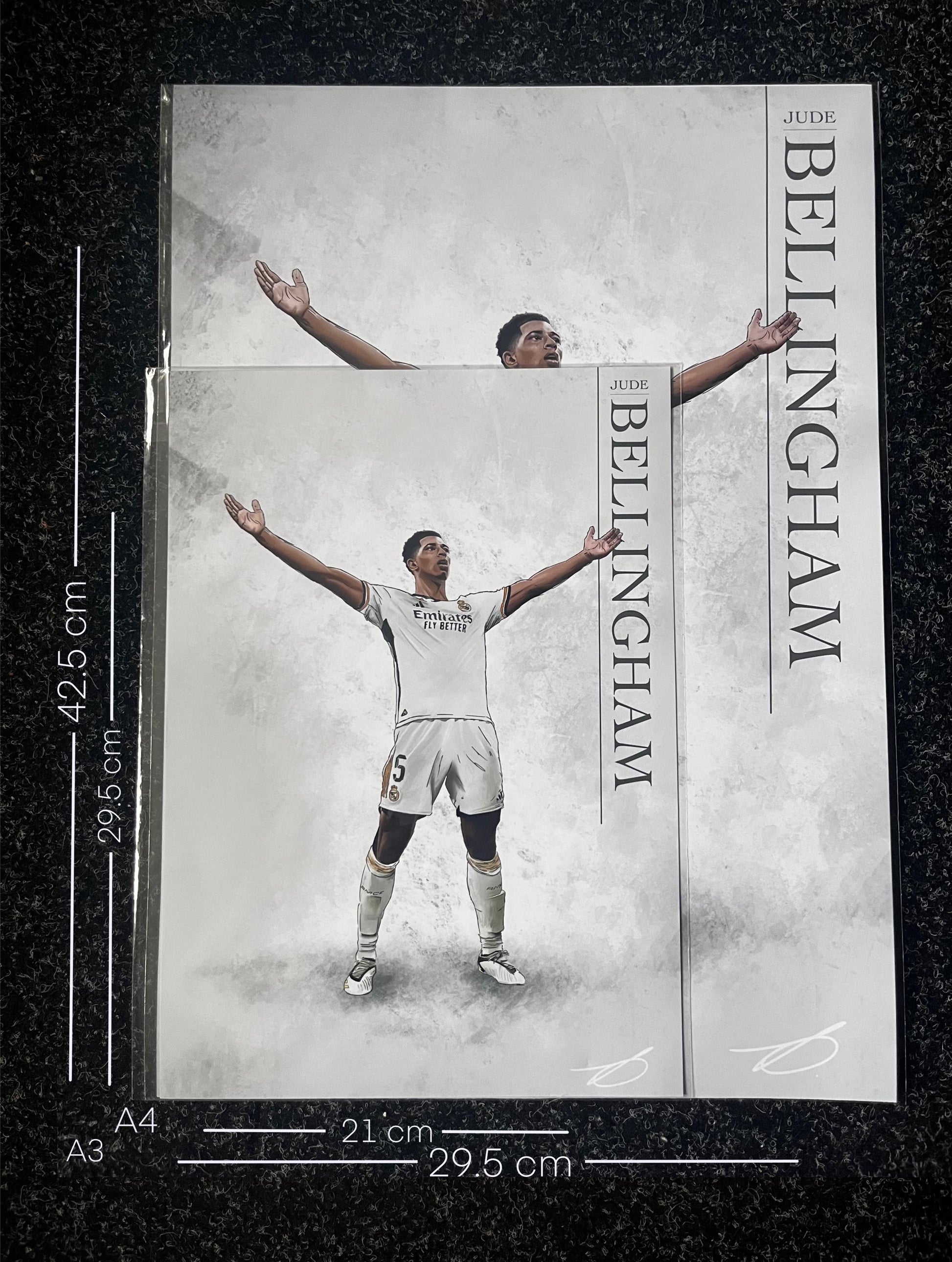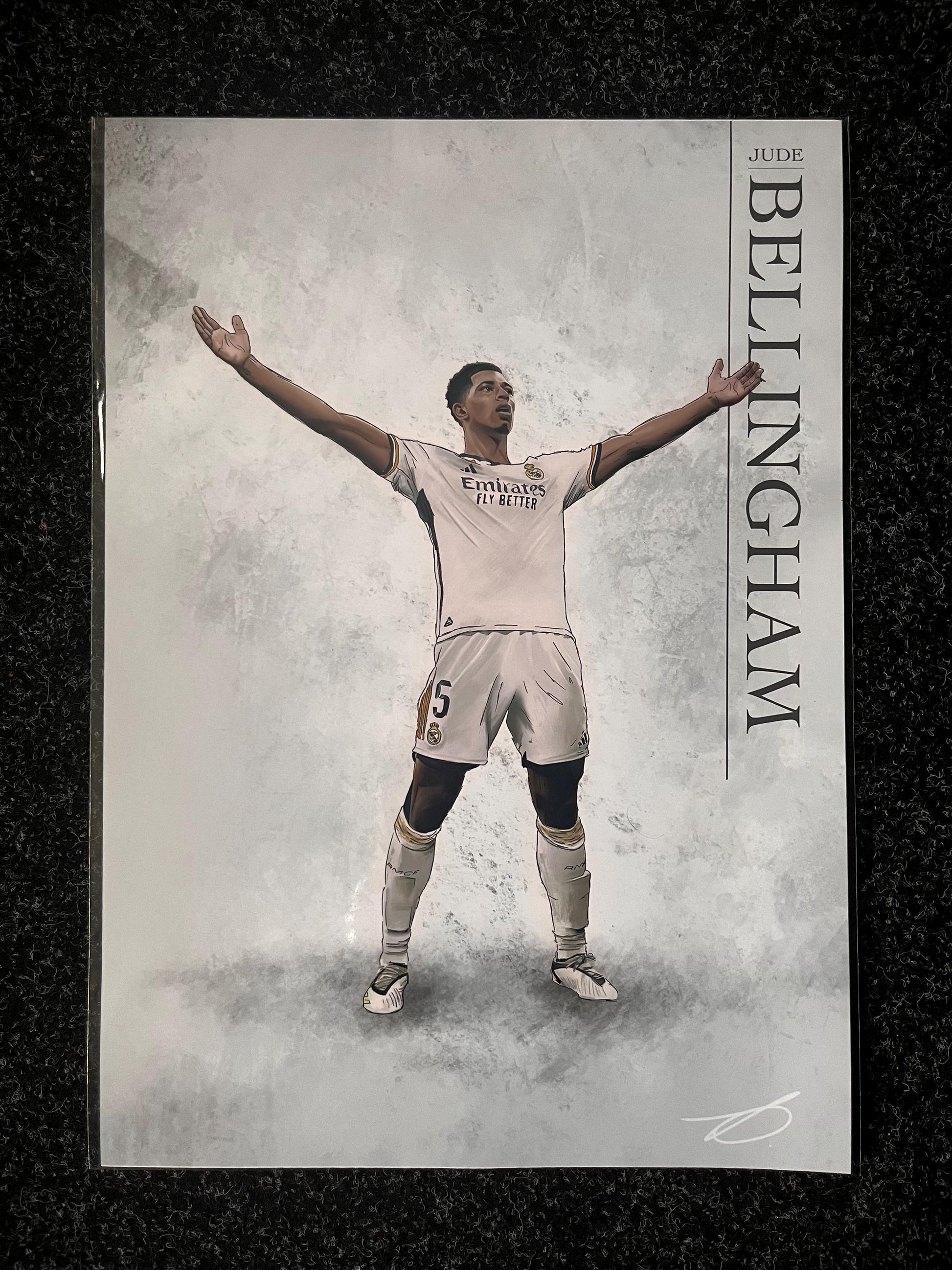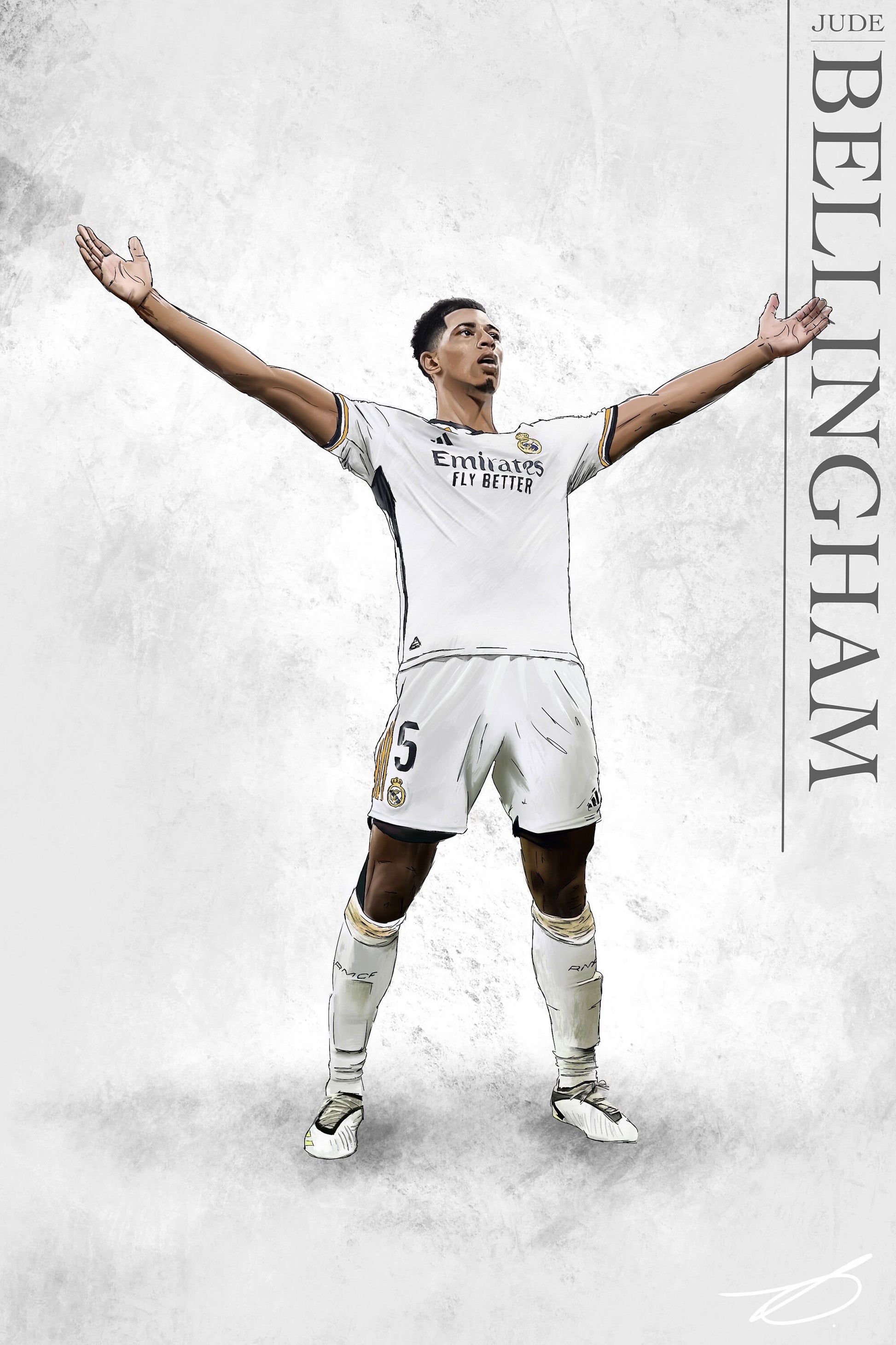 This piece features Real Madrid number 10 Jude Bellingham in his iconic celebration pose from his first season for the club, set against a textured white background.
