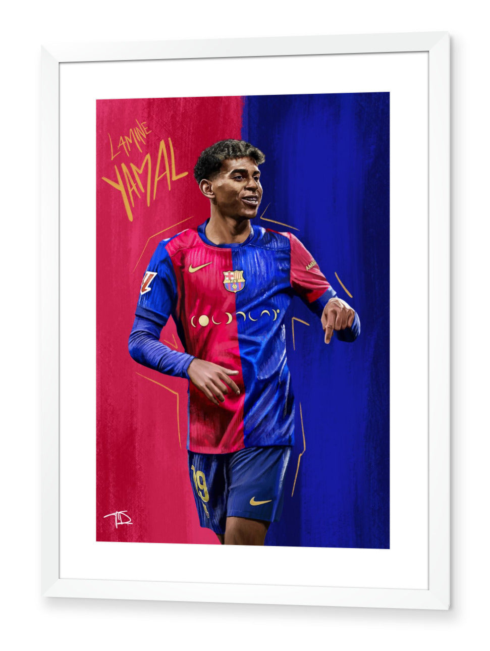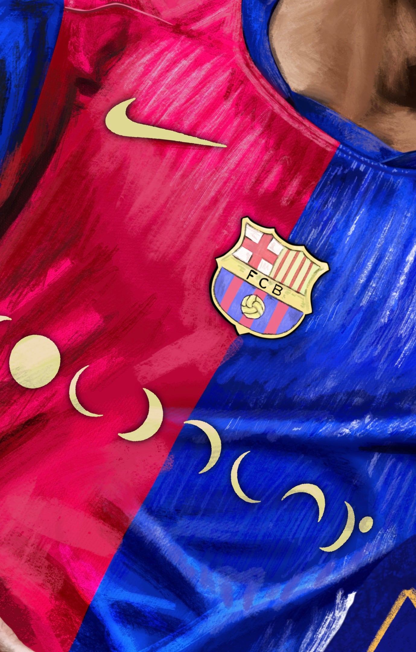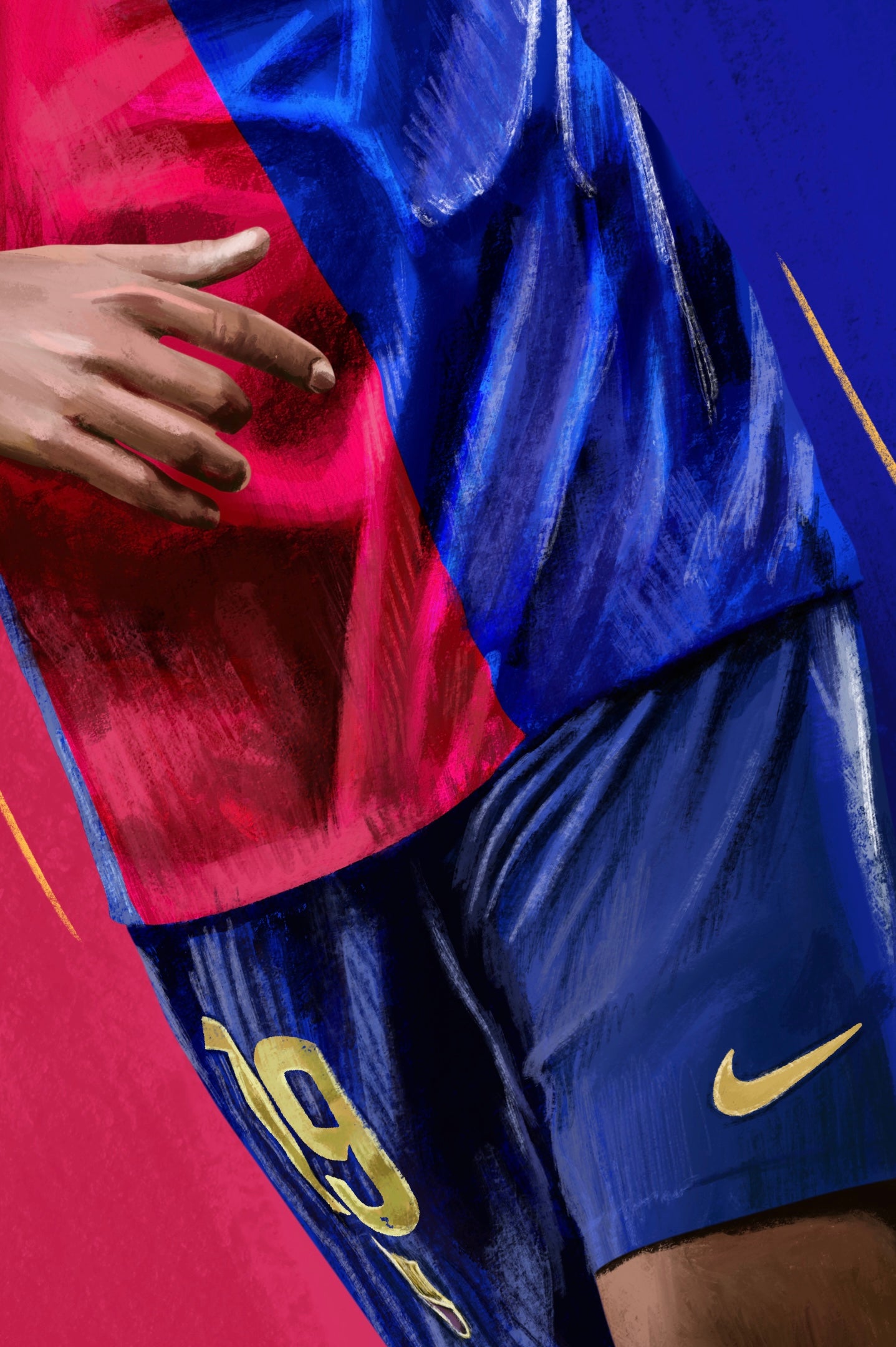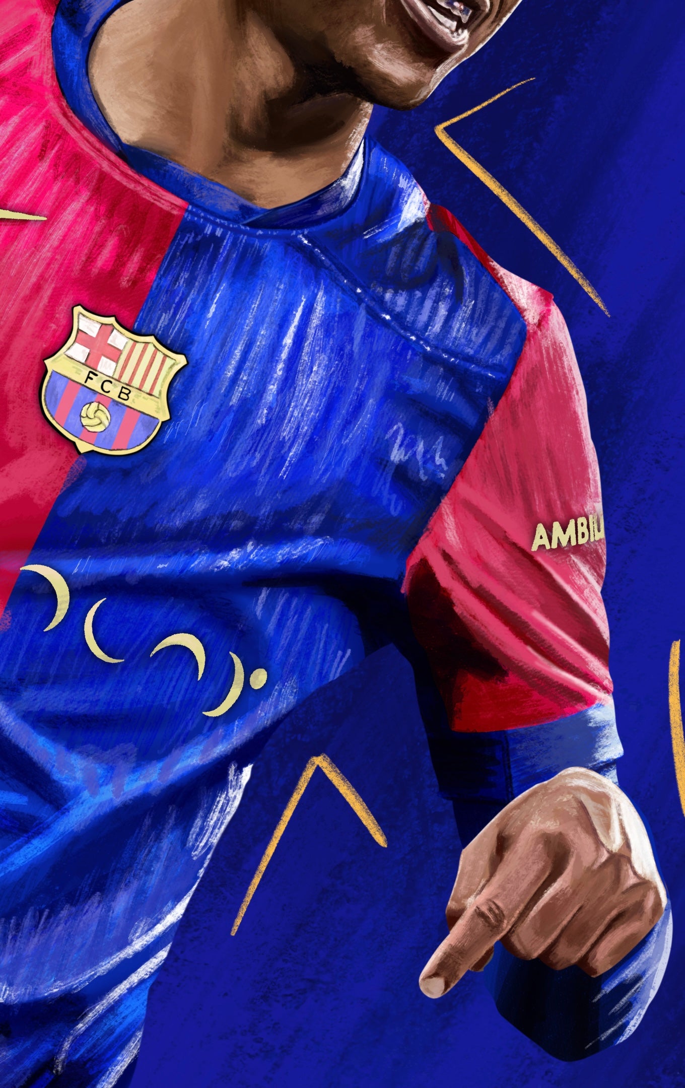 17 year old Lamine Yamal did this celebration at the Santiago Santiago Bernabau after scoring Barcelona's 3rd goal of the game, making it 3 nil. This goal made Lamine the youngest ever goalscorer in El Clasico history, a celebration and statistic worth drawing. I split the background using the famous Blaugrana colours which also matched the simplistic kit design.